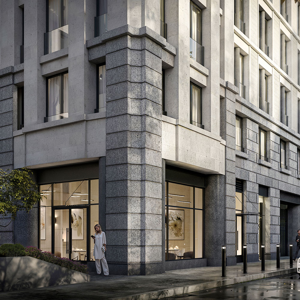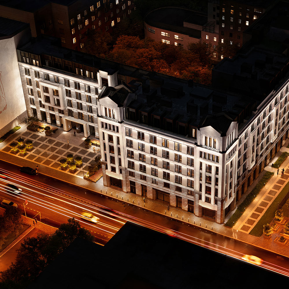 В доме всего 69 коллекционных лотов в 2-х секциях, которые объединены витражной анфиладой. Воздушные фасады из натурального камня в стиле «эклектика» украшены башенками, металлической инкрустацией, эркерами, рустами и карнизами, любоваться которыми будут целые поколения.