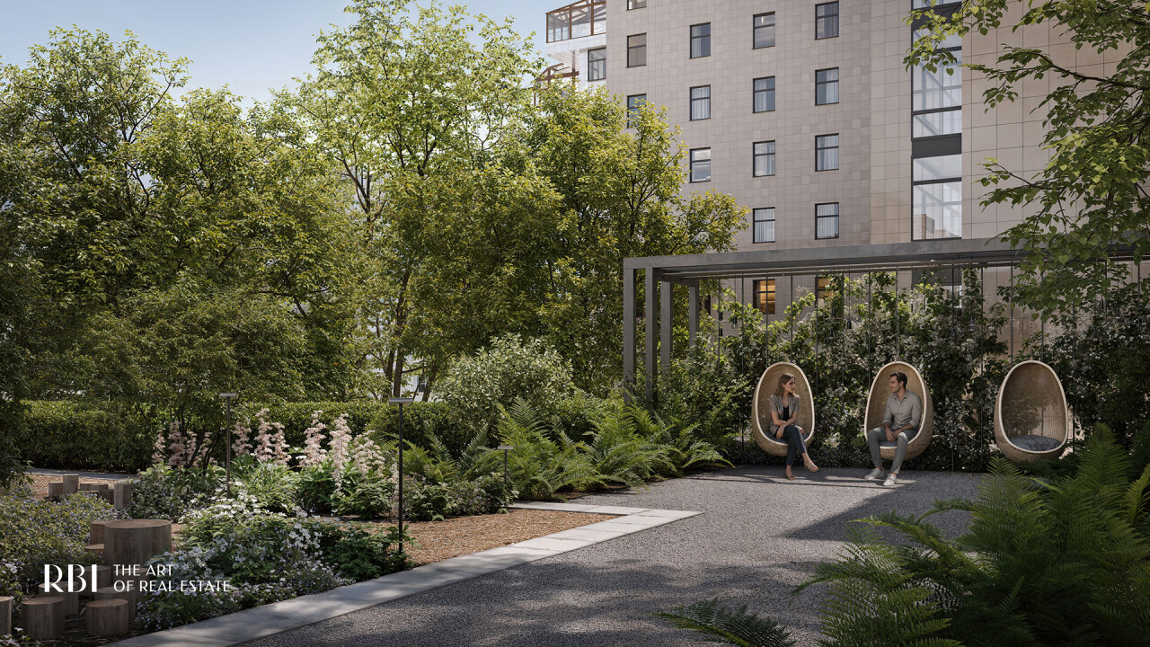 Извилистые тропинки в саду трав между деревьями формируют красивый пейзаж, визуально приятный как для тех, кто гуляет во дворе, так и для тех, кто смотрит на него из окна.